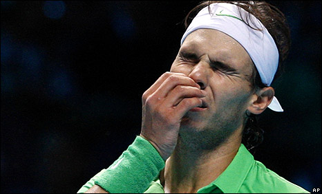 But he showed all his famous fighting spirit in a gripping second set, twice recovering from a break down against a nervy opponent to take it to a tie-break.Davydenko came through in the end, sealing victory with a rasping forehand after one hour and 47 minutes.The result leaves Nadal without a set after two matches, and means he will fail to reach the semi-finals for the first time in his three appearances at the season-ending tournament..